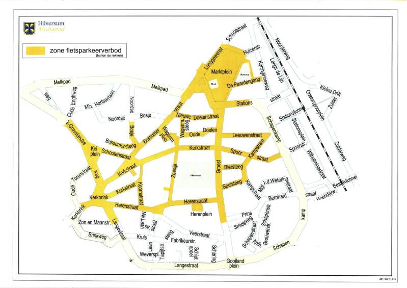 Hieronder een kaart van de fietsvrije zone in Hilversum-Centrum